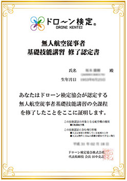 9時間のシミュレーション実技と1時間の実機による実技で上記の「無人航空従事者」終了認定書が取得できます。