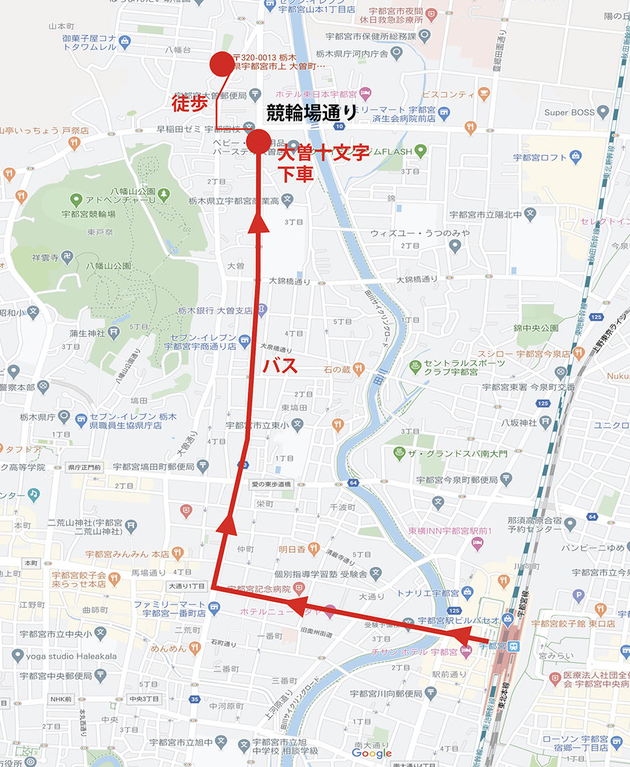 JR宇都宮下車 4番バス停 宇都宮美術館、帝京大学行き方面に乗り「大曽十文字」下車 吉野家とココスの交差点を北に徒歩150m道路沿西方(2分)